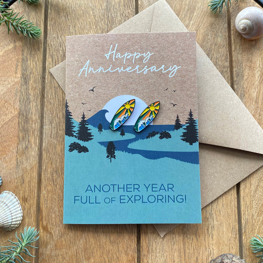 Surfing Anniversary Card for Travel Couple with keepsake Enamel Pin Badge