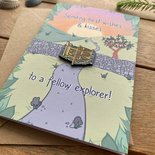 Hiker | Walker | Explorer Generic Kissing Gate Greetings Card with keepsake enamel pin